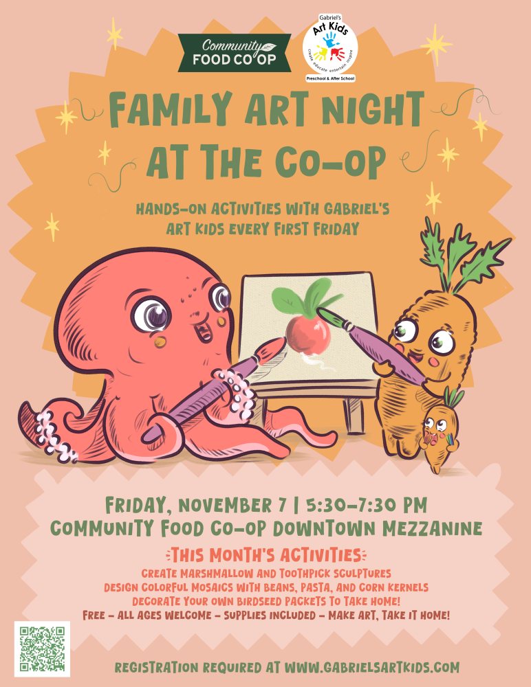 Join us for a FREE creative evening in the welcoming mezzanine at Community Food Co-op’s Downtown store. Celebrate creativity and community with guided art make-and-take projects designed by Gabriel's Art Kids for kids and families.