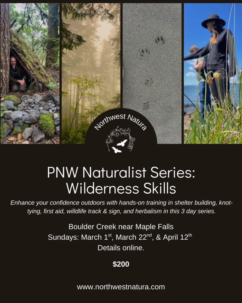 This series is for adult individuals at any skill level who are interested in ramping up their survival skills while having fun “surviving” outdoors and learning about plants, wildlife, fire craft, foraging, and ethnobotany. Each class will focus on both wilderness and naturalist skills to deepen your awareness of the natural world and empower you with practical knowledge and confidence in yourself out in PNW late winter conditions.