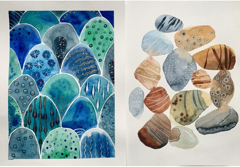 In this explorative course we will find our Zen by painting abstract watercolor patterns intuitively and freely. Each week we will explore different shapes, patterns, colors, and many various brush techniques. This class is sure to be fun, expressive and meditative. Week one we will focus on stones as a theme, week two will be scales and week three is free style where students have full creative freedom to utilize their newfound skills!
